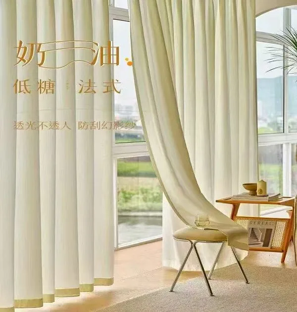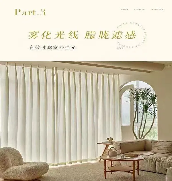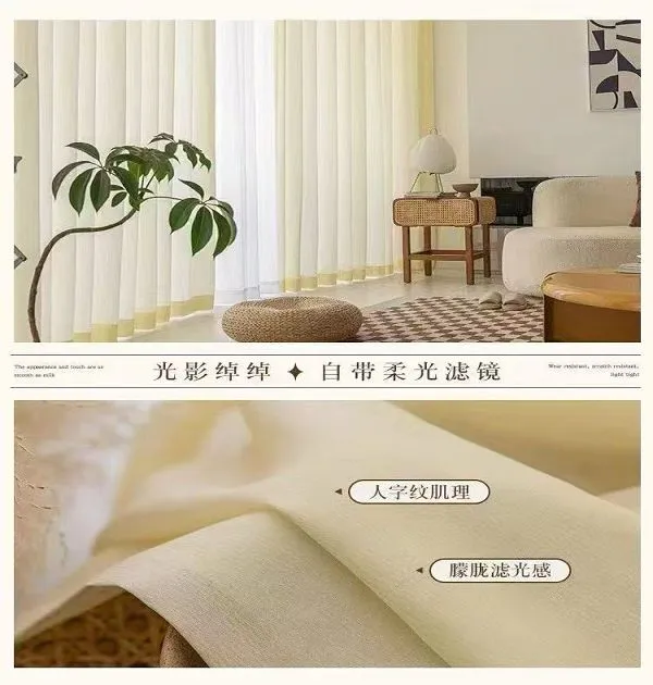 Wholesale beige phantom sheer curtain – high-count high-density ribbon-like weft twill weave. Scratch-resistant, delicate in texture, and available in 2.8/3.2/3.6m heights. Creates a soft hazy atmosphere, ideal for comfortable home spaces and daily use.