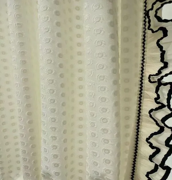 French Vintage Jacquard Sheer Curtain, Beige with Black Ruffled Edge Tieback, Elegant Light-Filtering Decor for Bedroom Living Room, Vintage Home Decor Essential